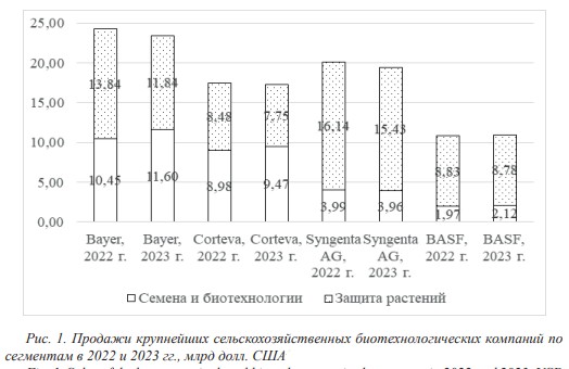 На рисунке 1 представлены данные по продажам приведенных выше компаний в ключевых сегментах. Если дополнить данные компании Syngenta AG (исторически существовавший бизнес в этой сфере с головными офисами в Швейцарии - защита растений и США - семена и биотехнологии) продажами приобретенной Syngenta Group в 2020 г. ADAMA (глобальный поставщик средств защиты растений с головной компанией в Израиле) и Syngenta Group China (диверсифицированный бизнес в агросекторе Китая), то это будет самая крупная компания данного сектора по обороту в мире. По данным объединенной группы ее выручка составила 33,4 и 32,2 млрд долл. США в 2022 и 2023 гг., соответственно. Но в эту цифру входят продажи значительной части бизнеса Syngenta Group China, включающей, помимо семян и защиты растений, прочие направления – цифровые сервисы, зерновой бизнес и питание растений.