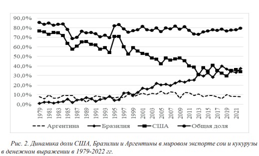 При этом, так же, как и по кукурузе, экспорт из конкурирующих стран, в частности из Латинской Америки, рос быстрее. Доля Аргентины в мировой торговле кукурузой и соей, несмотря на значительный рост ее экспортного потенциала, менялась условно незначительно. Но Бразилия очевидно стала той страной, которая забрала на себя потерянные позиции США на мировом рынке. Аналогичные результаты дает анализ данных FAO в разрезе ключевых регионов-импортеров сои и кукурузы, включая отдельно Азию и Африку. С одной стороны, результат этого анализа говорит об отсутствии явного влияния биотехнологий на динамику, приведенную на рисунке 2. Но, с другой перспективы, в частности по кукурузе, требуется учесть совместно два фактора: 1) стагнацию в секторе биоэтанола в США, которая выразилась в стабилизации потребления кукурузы для его производства после 2010 г. и 2) необходимость увеличения экспорта на фоне растущего внутреннего производства и конкуренции на мировом рынке. Поэтому описанные выше комплексные действия с участием крупных корпораций являются объяснимыми с точки зрения стратегических интересов США и вряд ли могут быть отнесены лишь к сфере коммерческих интересов отдельных компаний. При этом, если рассматривать сферу биотехнологических разработок в отдельности, то технологический контроль на внешних рынках может позволить в определенной степени говорить и о контроле сельскохозяйственного производства в других странах.