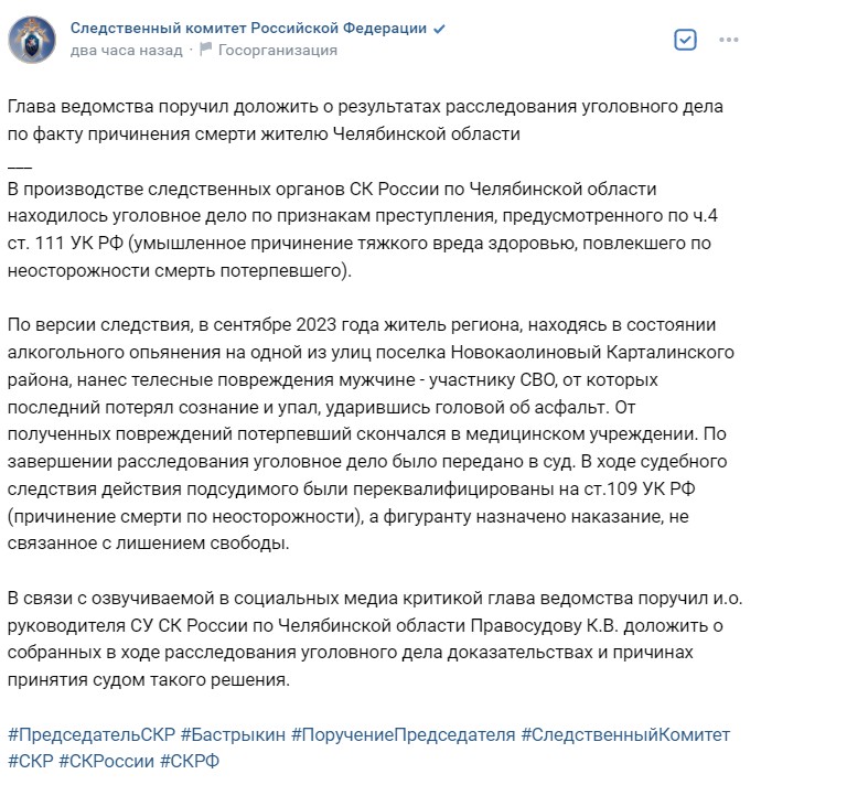 "В производстве следственных органов СК России по Челябинской области находилось уголовное дело по признакам преступления, предусмотренного по ч. 4 ст. 111 УК РФ (умышленное причинение тяжкого вреда здоровью, повлекшего по неосторожности смерть потерпевшего). По версии следствия, в сентябре 2023 года житель региона, находясь в состоянии алкогольного опьянения на одной из улиц поселка Новокаолиновый Карталинского района, нанёс телесные повреждения мужчине — участнику СВО, от которых последний потерял сознание и упал, ударившись головой об асфальт. От полученных повреждений потерпевший скончался в медицинском учреждении. По завершении расследования уголовное дело было передано в суд. В ходе судебного следствия действия подсудимого были переквалифицированы на ст. 109 УК РФ (причинение смерти по неосторожности), а фигуранту назначено наказание, не связанное с лишением свободы. В связи с озвучиваемой в социальных медиа критикой глава ведомства поручил и.о. руководителя СУ СК России по Челябинской области Правосудову К.В. доложить о собранных в ходе расследования уголовного дела доказательствах и причинах принятия судом такого решения", - гласит пресс-релиз Следственного комитета Российской Федерации.