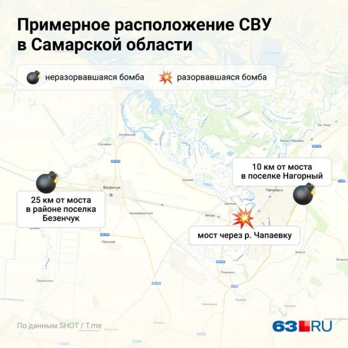 Вскоре пришли дополнительные сведения. Mash: "Ещё два самодельных взрывных устройства нашли под ж/д полотном в Самарской области — в районе посёлков Безенчук и Нагорный. Первое СВУ — в Безенчуке — находилось на том же пути, где и мост через реку Чапаевка — там сегодня утром был взрыв. Вторая находка — в Нагорном — уже другая линия рельсов, находящаяся неподалёку. Оба не сдетанировали, с ними работают спецы". SHOT: "Найдены ещё два взрывных устройства в районе посёлка Безенчук примерно в 25 км от моста и посёлка Нагорный — в 10 км от моста".
