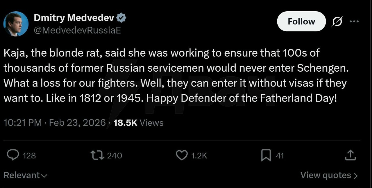 Вечером 23 февраля на слова г-жи Каллас ответил Дмитрий Медведев, заместитель председателя Совета Безопасности России: "Белокурая крыса Кая сказала, что она работает над тем, чтобы сотни тысяч бывших российских военнослужащих никогда не въехали в Шенгенскую зону. Какая потеря для наших бойцов! Что ж, они могут въехать туда и без всяких виз, если захотят. Как в 1812 или 1945 году. С Днём защитника Отечества!"