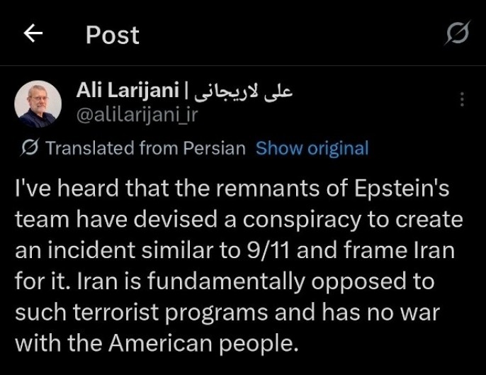 "Вполне логично, учитывая, что даже среди республиканского электората появляется всё больше людей, выступающих против продолжения войны, которая, как им кажется, ведётся не ради интересов Америки, а ради обязательств перед Израилем. В этих условиях большой, громкий теракт становится чуть ли не единственным способом обуздать данную волну", - заметил военкор Юрий Котенок. Политолог, востоковед Каринэ Геворгян: "Увы, но это вполне реально, ибо США правят безумцы. Они уверены в том, что если однажды уже прокатило (а теракты 11 сентября 2001 янки умело использовали как повод для установления своей гегемонии на Ближнем Востоке), то прокатит и второй раз. Обычным американцам мы бы искренне советовали проявлять осторожность. Ваше правительство хочет вас убить. И, к сожалению, это не конспирология, это факт. При этом могут быть использованы беспилотники Lucas — копии модификации Шахедов". "Царьград": "Американские элиты никогда не считались с жизнями не то что мирных граждан любой страны в мире, но и своей собственной". Портал "ИнфоТут": "Заявление прозвучало на семнадцатый день операции «Эпическая ярость» — в момент острой эскалации конфликта. Накануне, 14 марта, Иран объявил об эвакуации трёх крупнейших портов ОАЭ, атаковал отделения Citibank в Дубае и Манаме, а КСИР нанёс самый мощный ракетный удар с начала войны. Именно в этом контексте Тегеран, судя по всему, опасается провокации, которая могла бы дать Вашингтону повод для резкой эскалации — вплоть до наземной операции. <…> Само по себе заявление Лариджани является значимым политическим сигналом. Оно свидетельствует о том, что иранское руководство всерьёз рассматривает сценарий провокации как возможный инструмент американской политики — и заблаговременно публично его дезавуирует". EurAsia Daily: "Очевидно, он имел в виду и Дональда Трампа, который также общался с Эпштейном и фигурирует в документах, которые публикует Минюст США. <…> Ранее секретарь Совбеза Ирана иронично писал, что лидеры его страны находятся среди людей, а не на острове Эпштейна".
