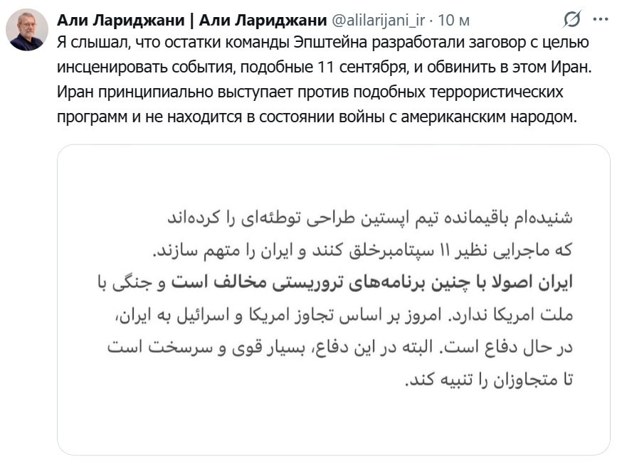 "Я слышал, что оставшиеся члены команды Эпштейна разработали заговор с целью устроить инцидент наподобие 9/11 и обвинить в этом Иран", - написал он в воскресенье в соцсети X.