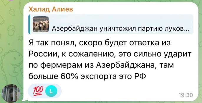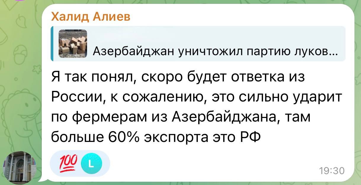 Добавим, что Агентство продовольственной безопасности Азербайджанской Республики в скоростном режиме уничтожило 639-килограммовую партию луковых колец, произведённых на российском предприятии "Мираторг Запад". Исследование проб внезапно выявило патогенные бактерии. По утверждению азербайджанцев, сотрудники "Мираторг Запад" тоже нашли опасные для здоровья микроорганизмы. Но нет, руководство Azərbaycan Respublikasının Qida Təhlükəsizliyi Agentliyi тупо лжёт. Проведённое на предприятии "Мираторг Запад" внутреннее расследование не выявило отклонений от санитарных нормативов и несоответствий санитарным требованиям технических регламентов Таможенного союза. Рубрика "Их борьба". Ничего, скоро мы много всякой гадости найдём в азербайджанской продукции - помидоры, ждите ответа.