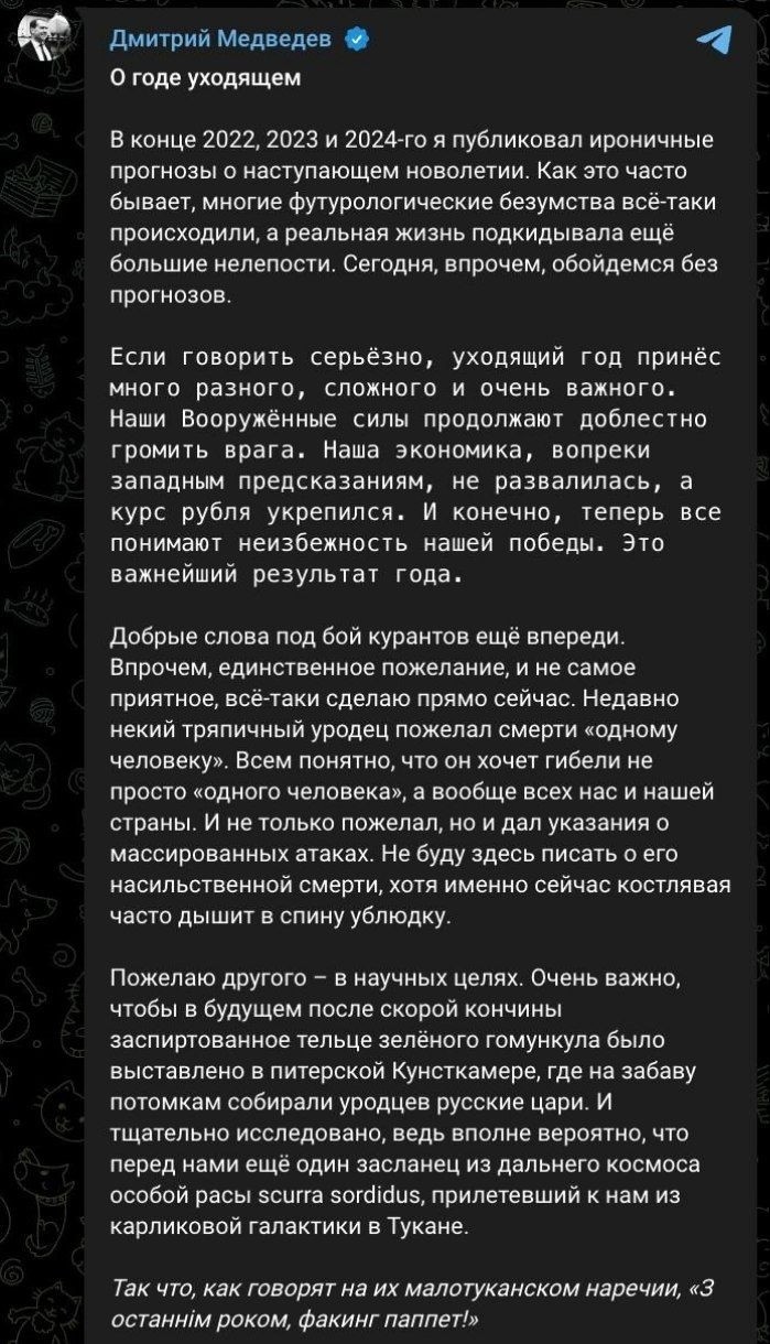Если говорить серьёзно, уходящий год принёс много разного, сложного и очень важного. Наши Вооружённые силы продолжают доблестно громить врага. Наша экономика, вопреки западным предсказаниям, не развалилась, а курс рубля укрепился. И конечно, теперь все понимают неизбежность нашей победы. Это важнейший результат года.