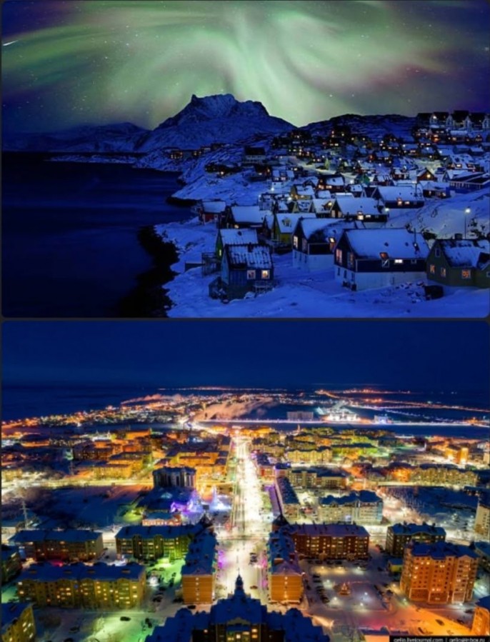 "Первое фото — это ночной Нуук в Гренландии. Второе — российский Салехард. Оба города находятся на 64-м градусе северной широты. При этим средняя температура в январе в Нууке -7, а на Ямале -28. Но первый выглядит как деревня, а второй светится как Лас-Вегас. Может поэтому Трамп так переживает за Арктику? Настоящий Север бывает только русским", - написал журналист.