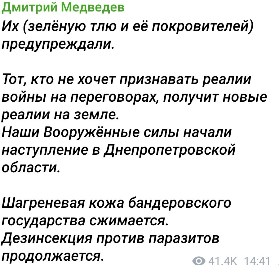 Заместитель председателя Совета Безопасности России и первый заместитель председателя Военно-промышленной комиссии РФ Дмитрий Медведев: "Их (зелёную тлю и её покровителей) предупреждали. Тот, кто не хочет признавать реалии войны на переговорах, получит новые реалии на земле. Наши Вооружённые Силы начали наступление в Днепропетровской области. Шагреневая кожа бандеровского государства сжимается. Дезинсекция против паразитов продолжается".
