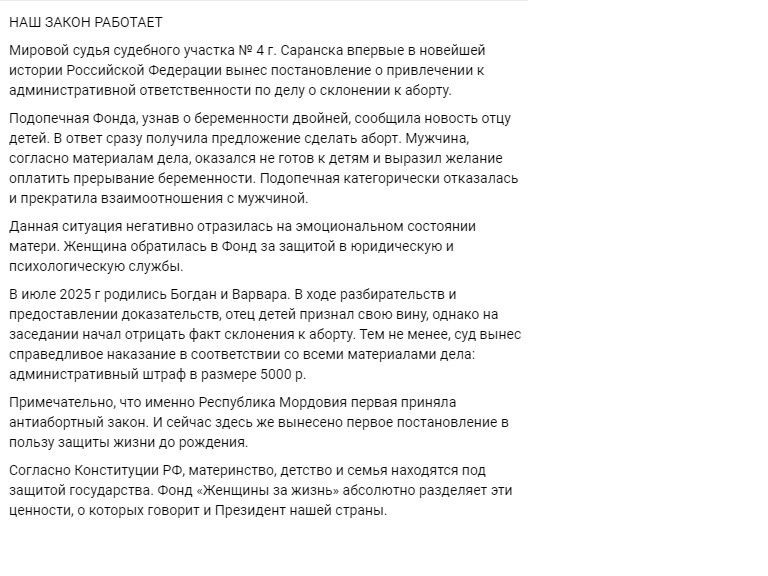 "НАШ ЗАКОН РАБОТАЕТ. Мировой судья судебного участка № 4 г. Саранска впервые в новейшей истории Российской Федерации вынес постановление о привлечении к административной ответственности по делу о склонении к аборту. Подопечная Фонда, узнав о беременности двойней, сообщила новость отцу детей. В ответ сразу получила предложение сделать аборт. Мужчина, согласно материалам дела, оказался не готов к детям и выразил желание оплатить прерывание беременности. Подопечная категорически отказалась и прекратила взаимоотношения с мужчиной. Данная ситуация негативно отразилась на эмоциональном состоянии матери. Женщина обратилась в Фонд за защитой в юридическую и психологическую службы. В июле 2025-го родились Богдан и Варвара. В ходе разбирательств и предоставлении доказательств, отец детей признал свою вину, однако на заседании начал отрицать факт склонения к аборту. Тем не менее, суд назначил справедливое наказание в соответствии со всеми материалами дела: административный штраф в размере 5000 р. Примечательно, что именно Республика Мордовия первая приняла антиабортный закон. И сейчас здесь же вынесено первое постановление в пользу защиты жизни до рождения. Согласно Конституции РФ, материнство, детство и семья находятся под защитой государства. Фонд «Женщины за жизнь» абсолютно разделяет эти ценности, о которых говорит и Президент нашей страны".