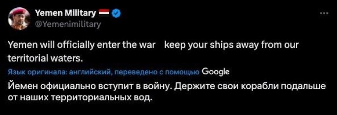 Хуситы наготове. Член политбюро йеменского движения "Ансар Аллах" Мухаммед Али аль-Бухейти: "Наше соглашение с США (о прекращении огня - Прим.) действовало только до агрессии этой страны против Ирана. Сегодня мы стоим плечом к плечу с нашими братьями в Иране против США и сионистского режима. Наш военный ответ уже в пути, и на первом этапе мы нанесём удар по американским силам в Красном море". Официальный представитель йеменских вооружённых сил бригадный генерал Яхья ас-Сари в соцсети X: "Йемен официально вступит в войну. Держите свои корабли подальше от наших территориальных вод"; в качестве дополнения размещена карикатура на Трампа и Нетаньяху.