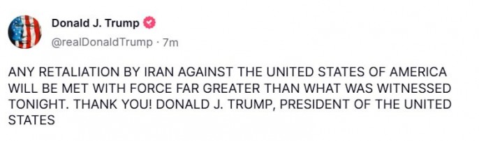 Позже "миротворец" разразился целиком капслоковой записью, угрожая Тегерану: "ЛЮБЫЕ ОТВЕТНЫЕ ДЕЙСТВИЯ ИРАНА ПРОТИВ СОЕДИНЁННЫХ ШТАТОВ АМЕРИКИ БУДУТ ВСТРЕЧЕНЫ С ГОРАЗДО БОЛЬШЕЙ СИЛОЙ, ЧЕМ ТА, КОТОРОЙ МЫ БЫЛИ СВИДЕТЕЛЯМИ СЕГОДНЯ ВЕЧЕРОМ, СПАСИБО! ДОНАЛЬД ДЖ. ТРАМП, ПРЕЗИДЕНТ СОЕДИНЁННЫХ ШТАТОВ".