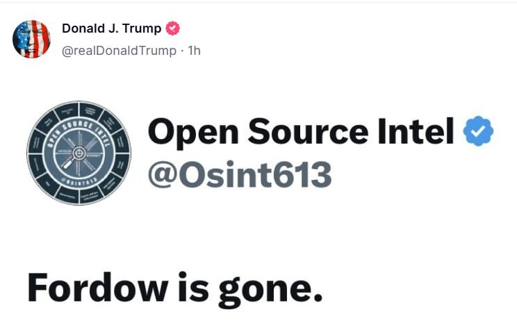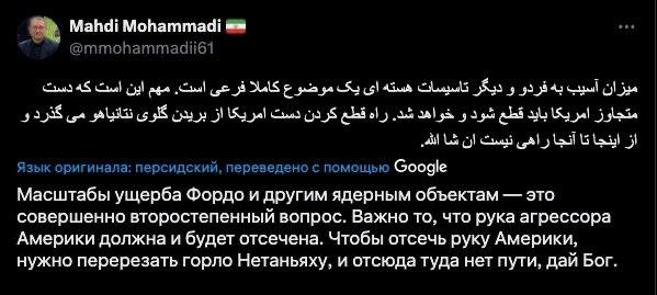Дональд отдельно репостнул: "Фордо уничтожен". Между тем, пострадала только внешняя инфраструктура. Депутат иранского парламента Маннан Раиси, представляющий ближайший к Фордо город Кум: "Вопреки заявлениям лживого президента США, ядерные объекты в Фордо не получили серьёзных повреждений. Уничтожены лишь наземные сооружения, которые можно восстановить. Кроме того, всё, что могло представлять опасность для населения, было заранее эвакуировано. О каких-либо ядерных выбросах не сообщается. Лживые заявления Трампа об «уничтожении Фордо» опровергает уже тот факт, что атаки были настолько поверхностными, что на объекте нет даже погибших. Но и такую агрессию США мы расцениваем как прямое вступление Америки в войну. Теперь Иран будет решать, как и каким образом ответить на откровенную глупость США".