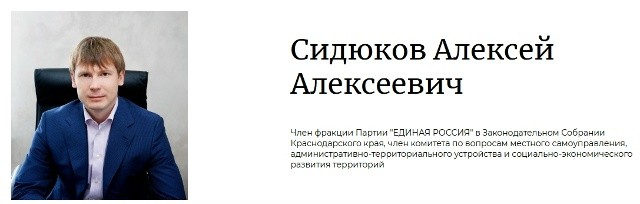 Алексей Алексеевич Сидюков родился 13.08.1979 на хуторе Бойкопонура в Калининском районе. В 2001-м окончил Кубанский государственный аграрный университет по специальности "Бухгалтерский учёт и аудит". В 2002-м стал директором ООО "Русагропродукт", через год - совладельцем компаний "Мастер геймс" (поставка игровых автоматов) и "Бонус" (аренда игровых залов, проведение розыгрышей в двух десятках кубанских станиц), в 2005-м возглавил созданное в результате приватизации Краснодарского комбината хлебопродуктов ООО "Краснодарзернопродукт-Экспо" (вокруг компании впоследствии сформировалась гигантская ГК "Краснодарзернопродукт"). Тоже был депутатом ЗакСа пятого созыва (секретарь комитета по физической культуре, спорту и делам молодёжи, секретарь Совета молодых депутатов Краснодарского края) от ЕР. 4.02.2014 принимал участие в эстафете олимпийского огня в Краснодаре. 10.09.2017 избран в Заксобрание VI созыва (член комитета по вопросам местного самоуправления, административно-территориального устройства и социально-экономического развития территорий) от "Единой России". Награждён благодарностью губернатора, благодарственным письмом Законодательного собрания, медалью "За вклад в развитие законодательства Краснодарского края", почётной грамотой главы администрации муниципального образования Калининский район "за активную жизненную позицию". В январе 2024-го стал совладельцем активов ГК "Агропрайм", заявив о намерении продолжить реализовывать проекты "Агропрайма" общей стоимостью более 6,6 млрд руб., включая строительство крупного маслоэкстракционного завода в селе Троицком Неклиновского района и зернового терминала в морском порту Азова, реконструкцию Ахтырского маслозавода. Сидюковская группа компаний "Краснодарзернопродукт" (зернотрейдинговая компания "КЗП-Экспо", агрофирмы на территории Краснодарского и Ставропольского краёв, стивидорная компания "Ейск-Порт-Виста" с терминалом в Ейском порту мощностью перевалки 1 млн т сухих грузов, винодельня "Мысхако" с ежегодным объёмом производства 6 млн бутылок и площадью виноградников 362 гектара, винзавод "Вина Лефкадии" и др.) - один из крупнейших экспортёров российского зерна, соучредитель Национальной ассоциации экспортёров сельскохозяйственной продукции. СМИ связывают Сидюкова с экс-министром сельского хозяйства РФ и экс-губернатором Кубани Александром Ткачёвым, а также с протеже последнего, экс-членом Совета Федерации и экс-первым заместителем министра сельского хозяйства РФ Евгением Громыко - якобы значительной частью своего состояния Сидюков может быть обязан именно им. Baza называет бывшего народного избранника миллиардером и утверждает, что "за время работы в Заксобрании Сидюков нарастил состояние в десятки раз и получил ВНЖ Турции".