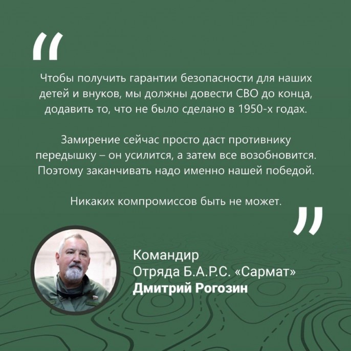 Командир добровольческого отряда роботизированных электронных комплексов и систем Б.А.Р.С. "Сармат", сенатор (представитель от исполнительного органа власти Запорожской области, член Комитета Совета Федерации по обороне и безопасности) Дмитрий Рогозин призвал отринуть псевдоблагородство, помнить, ни в коем случае не забывать - и точечно карать известных бесов Укрорейха, сделать всё, чтобы откровенную мразь "ели черви в земле".