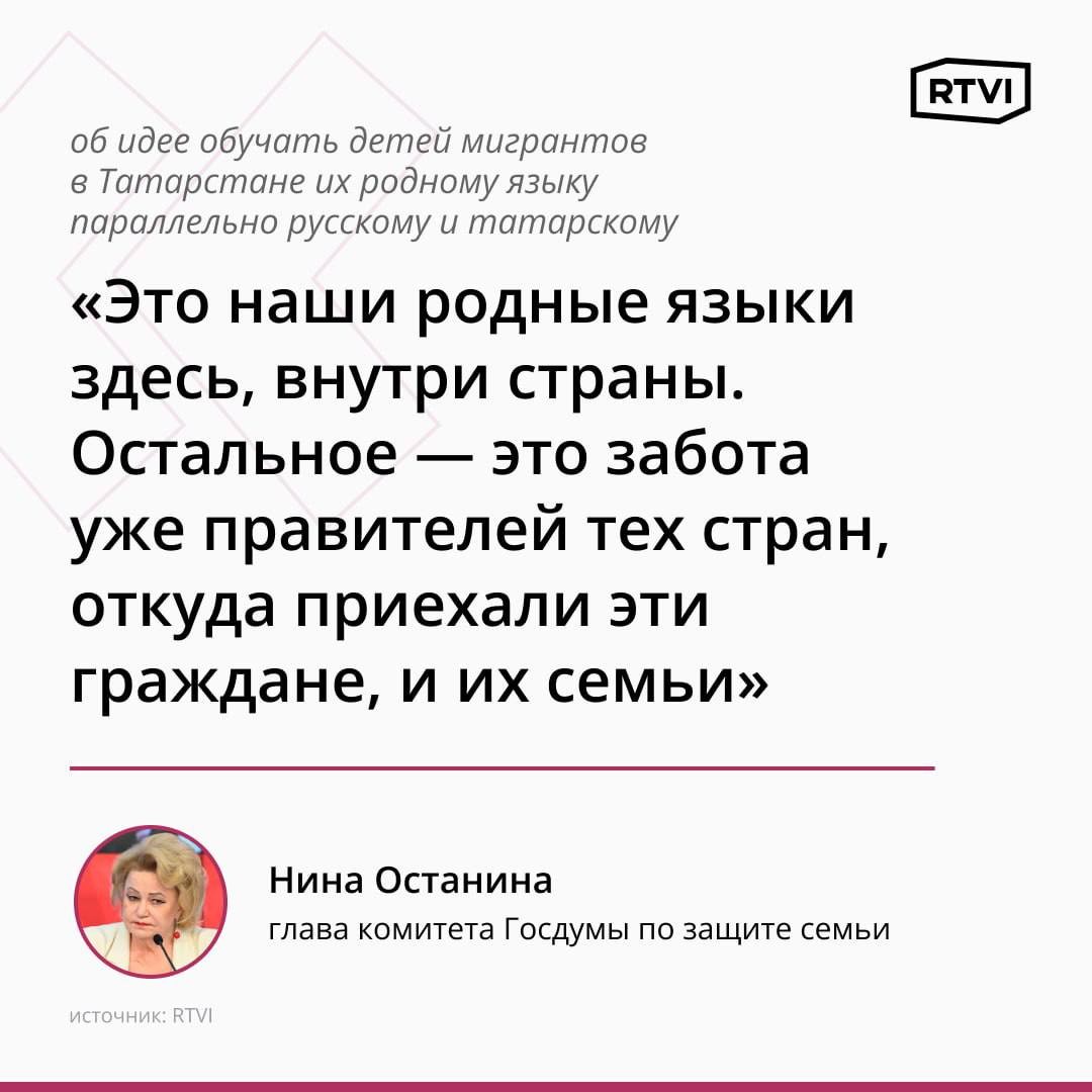 Председатель Комитета Госдумы РФ по защите семьи, вопросам отцовства, материнства и детства, председатель Всероссийского женского союза "Надежда России", член ЦК КПРФ Нина Останина в интервью RTVI согласилась с тем, что дети не должны забывать язык своих родителей. В многонациональной и многоязычной стране, какой является Россия, необходимо сохранить языки всех народов, в том числе малочисленных, пояснила депутат. Однако речь идёт о коренных российских этносах: "Но это наши родные языки здесь, внутри страны. Остальное — это забота уже правителей тех стран, откуда приехали эти граждане, и их семьи. Это дело уже диаспор внутри России, это дело тех руководителей государств, откуда приезжают к нам мигранты вместе со своими детьми. <…> Есть диаспора, есть родительский комитет — пожалуйста, пусть организовывают это за свой счёт. Но за бюджетный счёт мы просто не сможем обеспечить всем сохранение языков государств, откуда приехали к нам мигранты. <…> Танго танцуют двое. <…> Посмотрите, страны, откуда приезжают к нам многочисленные мигранты в поисках лучшей жизни. Мне искренне жаль, потому что приезжают они в основном для того, чтобы найти работу и выжить. Их граждане не готовы [находиться в России] с точки зрения знания культурных особенностей, национальных особенностей, языковых особенностей".