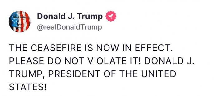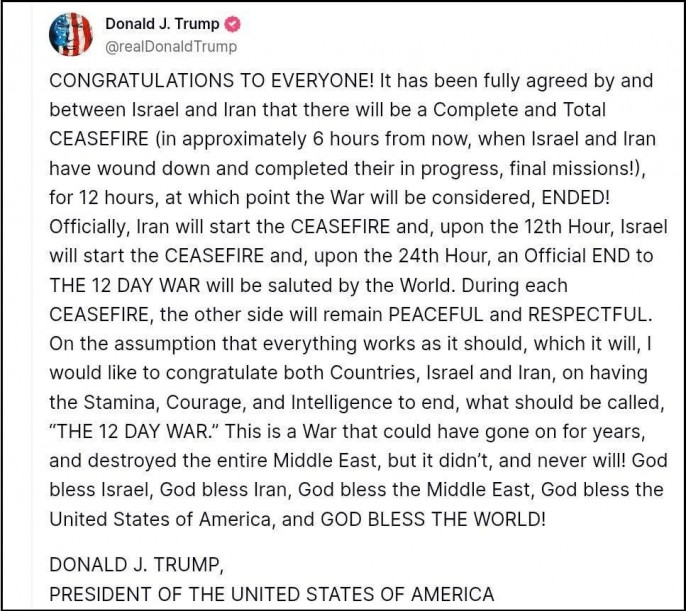 Ну а потом грянула сенсация. Трамп в свойственной ему истероидно-капслоковой манере внезапно объявил, что Иран и Израиль договорились о полном прекращении огня: "ПОЗДРАВЛЯЮ ВСЕХ! Израиль и Иран полностью договорились о том, что будет полное и тотальное ПРЕКРАЩЕНИЕ ОГНЯ (примерно через 6 часов, когда Израиль и Иран свернут и завершат свои текущие, последние миссии!) на 12 часов, после чего война будет считаться ЗАКОНЧЕННОЙ. Официально Иран начнёт ПРЕКРАЩЕНИЕ ОГНЯ, а в 12-й час Израиль начнёт ПРЕКРАЩЕНИЕ ОГНЯ, и в 24-й час мир будет салютовать официальному ОКОНЧАНИЮ 12-ДНЕВНОЙ ВОЙНЫ. Во время каждого ПРЕКРАЩЕНИЯ ОГНЯ другая сторона будет сохранять МИР и УВАЖЕНИЕ. Если предположить, что всё будет работать как надо, а так оно и будет, я хотел бы поздравить обе страны, Израиль и Иран, с тем, что у них хватило выдержки, мужества и ума закончить то, что следует назвать «12-ДНЕВНОЙ ВОЙНОЙ». Эта война могла бы продолжаться годами и уничтожить весь Ближний Восток, но этого не произошло, и никогда не произойдёт! Да благословит Бог Израиль, да благословит Бог Иран, да благословит Бог Ближний Восток, да благословит Бог Соединённые Штаты Америки, и ДА БЛАГОСЛОВИТ БОГ ВЕСЬ МИР!"