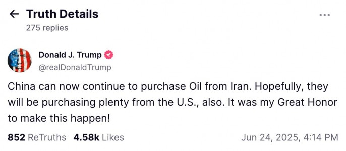 Снова Трамп. Упивается собой в предвкушении Нобелевки. "И Израиль, и Иран в равной степени хотели остановить войну! Для меня было великой честью уничтожить все ядерные объекты и потенциал, а затем — ОСТАНОВИТЬ ВОЙНУ!" "Теперь Китай может продолжать покупать нефть у Ирана. Надеюсь, он будет закупать её и у США — в больших объёмах. Для меня было великой честью добиться этого!"