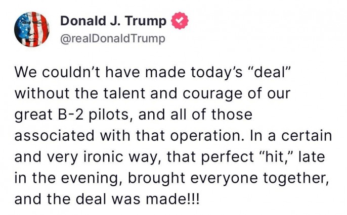 Далее. "Мы не смогли бы заключить сегодняшнюю «сделку» без таланта и мужества наших выдающихся лётчиков B-2 и всех, кто был причастен к этой операции. В определённом и весьма ироничном смысле этот безупречный «удар», нанесённый поздним вечером, сплотил всех, и сделка была заключена!!!"