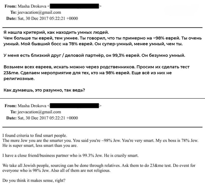 ТГ-канал "Беспощадный пиарщик": "Нам попалось давно забытое имя — Маша Дрокова, бывший пресс-секретарь молодёжного движения «Наши», бывшая пиарщица, у которой получилось. Построила карьеру, уехала в США, инвестировала в ряд американских стартапов, потом основала венчурный фонд, вышла замуж, сменив фамилию на Бухер, и продолжает успешную деятельность в своей сфере. На её официальном сайте есть ссылка на довольно свежий эпизод подкаста Techcrunch с её участием — от 3 декабря 2025 года. Начали слушать, и как нас накрыло: тот же тамбовский английский старой доброй Маши Дроковой, те же уловки и прыжки — Дрокову рекомендуют не иначе как «королеву пяра», которая начала профессиональную карьеру в 18 лет и стала успешным венчурным капиталистом, не оставив, впрочем, профессии. <...> Как следует из переписки, после получения гринкарты США в том же самом 2017 году Маша Дрокова активно контактировала с Эпштейном, Эпштейн оплачивал ей номер в гостинице Four Seasons, она отправляла ему свои нюдсы и умные мысли. Например, о том, что человек тем сообразительнее, чем он больше еврей. Эпштейн был евреем на 98%, бывший начальник и инвестор Дроковой, основатель Acronis, Parallels и Runa Capital Сергей Белоусов — на 78%. <...> Переписка с Дроковой от 2017 года. Эпштейн платил за Машу, которая приезжала в Нью-Йорк в декабре. Она забронировала номер в Four Seasons, он обещал покрыть расходы. В документах фигурирует сумма $7387 за номер. Также в файлах есть свидетельства того, что Дрокова пыталась познакомить своего бывшего босса — основателя Acronis и Parallels Сергея Белоусова и Эпштейна. И видимо, успешно, поскольку в переписке упоминается как минимум один звонок между ними. Также Маша свела Эпштейна с учёным-физиком Михаилом Лукиным, сообщив Эпштейну что он будущий лауреат Нобелевской премии. Кроме того, Дрокова делилась с Эпштейном информацией о том, что у неё много идей после употребления айяваски (аяуаска; галлюциногенный отвар, традиционно изготовляемый шаманами индейских племён бассейна Амазонки и употребляемый местными жителями для «общения с духами» - Прим.). <...> Дрокова описывает свой «приход» от айяваски: «Я видела, что создатель мира упростил себя до технологии, почти до формулы — чтобы не допустить ошибки в принципах, которые уже были открыты. Я видела этот принцип, но его невозможно выразить словами. Этот принцип постоянно упрощается, и всё же я могу соотнести с ним каждое событие и каждого человека. Он почти как некая определённая вибрация. И чем ближе ты к ней, тем большее значение это имеет для мира. Мы — всего лишь энергии и вибрации. Мы притягиваем людей со схожими вибрациями всякий раз, когда создаём больший резонанс, — так энергия продолжает расти, оставаясь в гармонии. Рост может быть интенсивным, но всё равно гармоничным. Забавно, что, как мы заметили, около 90 % новых людей, которых я встретила спустя несколько дней после этой работы, уже имели опыт работы с этим растением»".