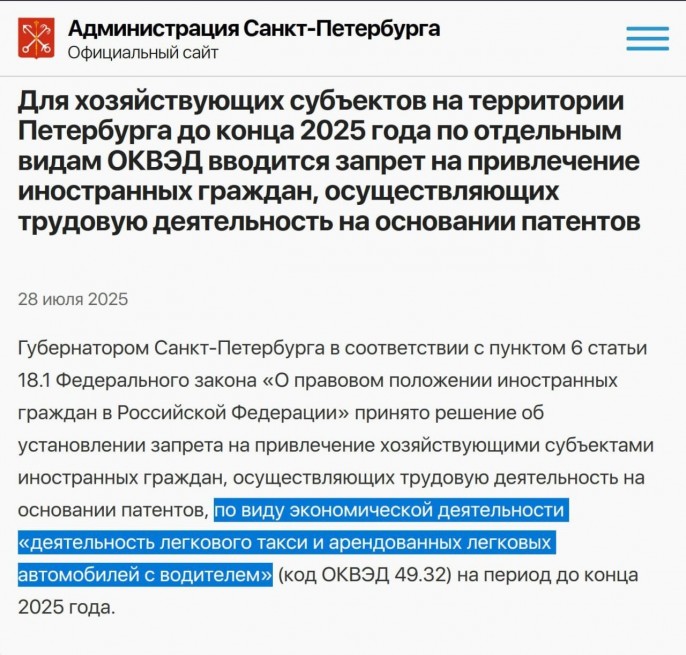 Об этом рассказала пресс-служба Смольного 28 июля. "Губернатором Санкт‑Петербурга в соответствии с пунктом 6 статьи 18.1 Федерального закона «О правовом положении иностранных граждан в Российской Федерации» принято решение об установлении запрета на привлечение хозяйствующими субъектами иностранных граждан, осуществляющих трудовую деятельность на основании патентов, по виду экономической деятельности «деятельность легкового такси и арендованных легковых автомобилей с водителем» (код ОКВЭД 49.32) на период до конца 2025 года. Решение направлено на повышение качества и безопасности услуг в сфере такси и создание дополнительных возможностей для трудоустройства граждан Российской Федерации. Для хозяйствующих субъектов предусмотрен трёхмесячный переходный период, в течение которого они смогут завершить действующие трудовые отношения и привлечь новых работников для осуществления своей деятельности по указанному ОКВЭД. Введение запрета на указанный временной период (до конца 2025 года) позволит на практике оценить его социально-экономическое влияние на жизнь города и принять взвешенное решение о необходимости применения подобных мер в 2026 году. Постановление вступит в силу по истечении 10 дней", - говорится в сообщении.