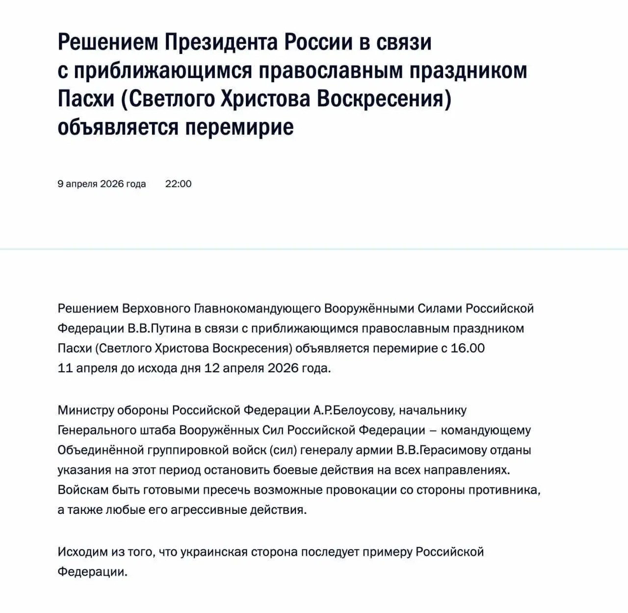 "Решением Верховного Главнокомандующего Вооружёнными Силами Российской Федерации В. В. Путина в связи с приближающимся православным праздником Пасхи (Светлого Христова Воскресения) объявляется перемирие с 16.00 11 апреля до исхода дня 12 апреля 2026 года.