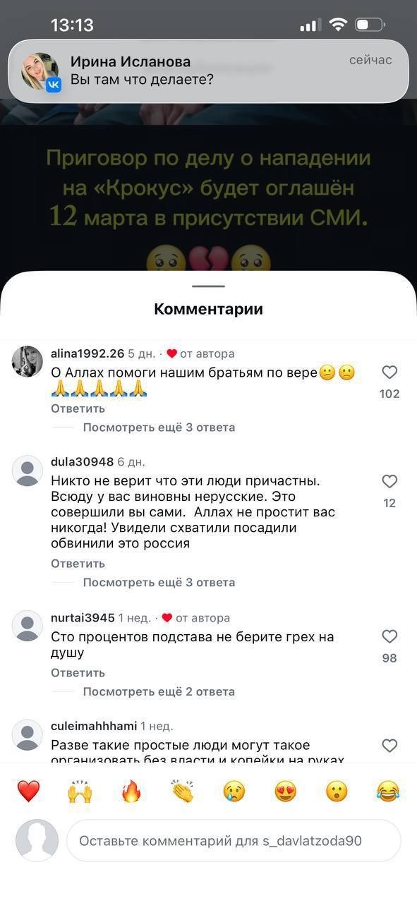 "В Питере осудили ценного специалиста из Средней Азии за публичное оправдание теракта в «Крокус Сити Холле». Задержали его в ноябре 2025 года после ряда соответствующих публикаций в соцсетях. Вину он полностью признал. И даже сообщил, что собирался стать «шахидом» и «бороться с неверными». 1-й Западный окружной военный суд «заземлил» его на 6 лет лишения свободы. Но посмотрите «тематические» аккаунты в соцсетях. Таких, как этот, целые батальоны. И все они живут среди нас. Плодотворная почва для вербовки и диверсионной работы. И для работы силовиков, разумеется. Наших в первую очередь", - подчеркнул военкор Александр Коц.