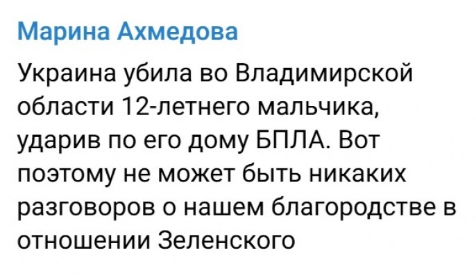 "Украина убила во Владимирской области 12-летнего мальчика, ударив по его дому БПЛА. Вот поэтому не может быть никаких разговоров о нашем благородстве в отношении Зеленского", - подчеркнула главный редактор ИА "Регнум" Марина Ахмедова.